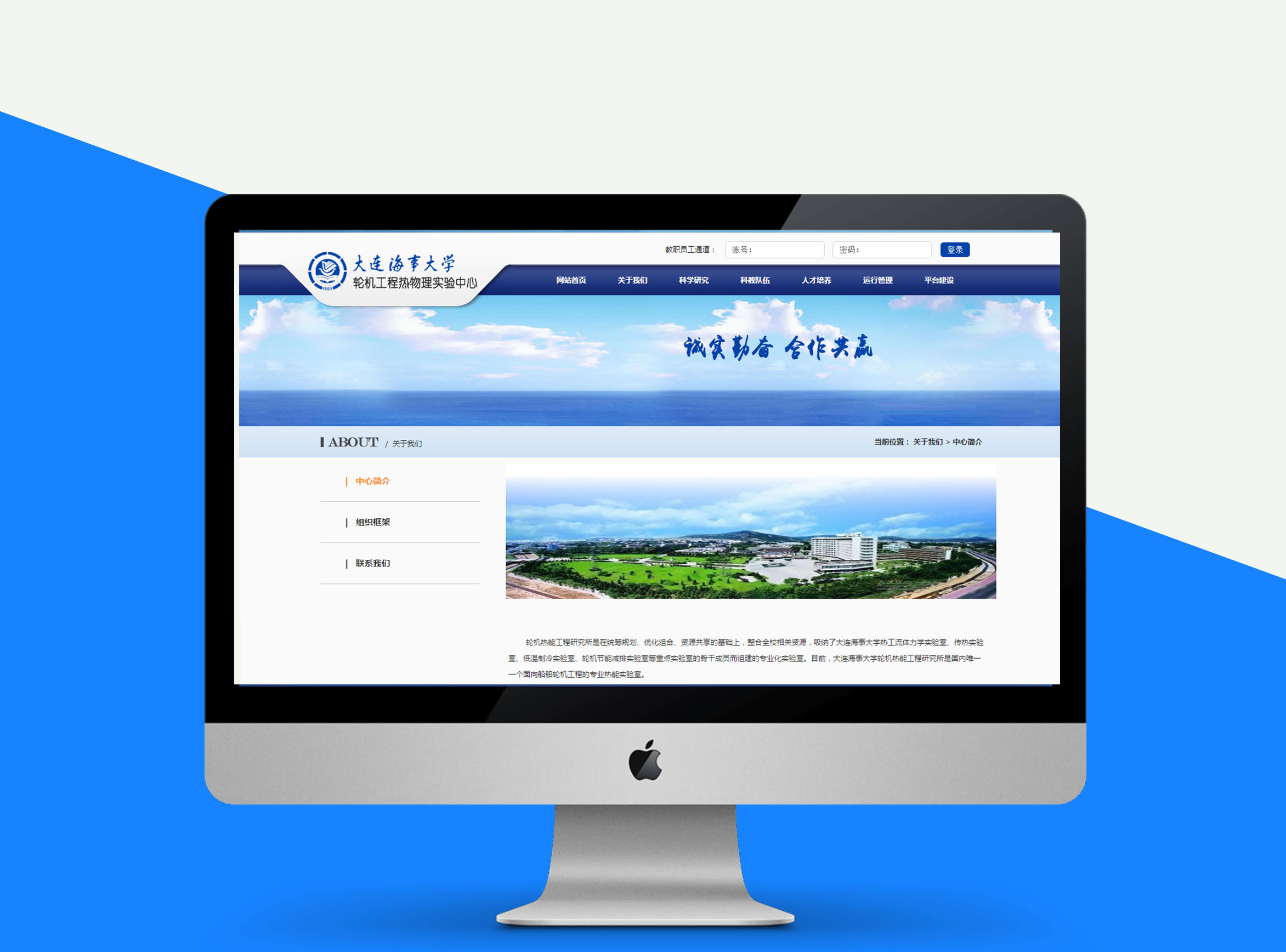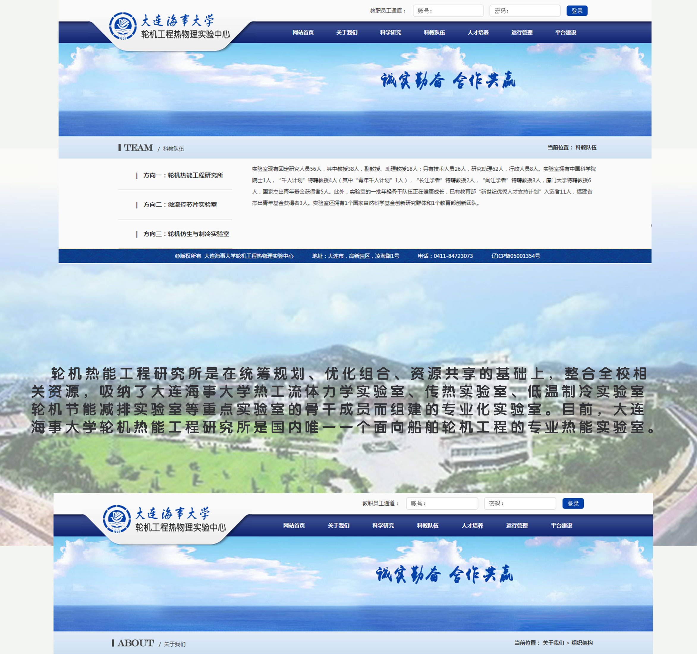 大连海事轮机工程热物理实验中心网站:展示新闻、研究项目、组织框架、科学研究内容、科教队伍等模块,设有教职员工登录通道,对个人信息加以维护。网站采用蓝色系主色调,突出海事相关研究特点。