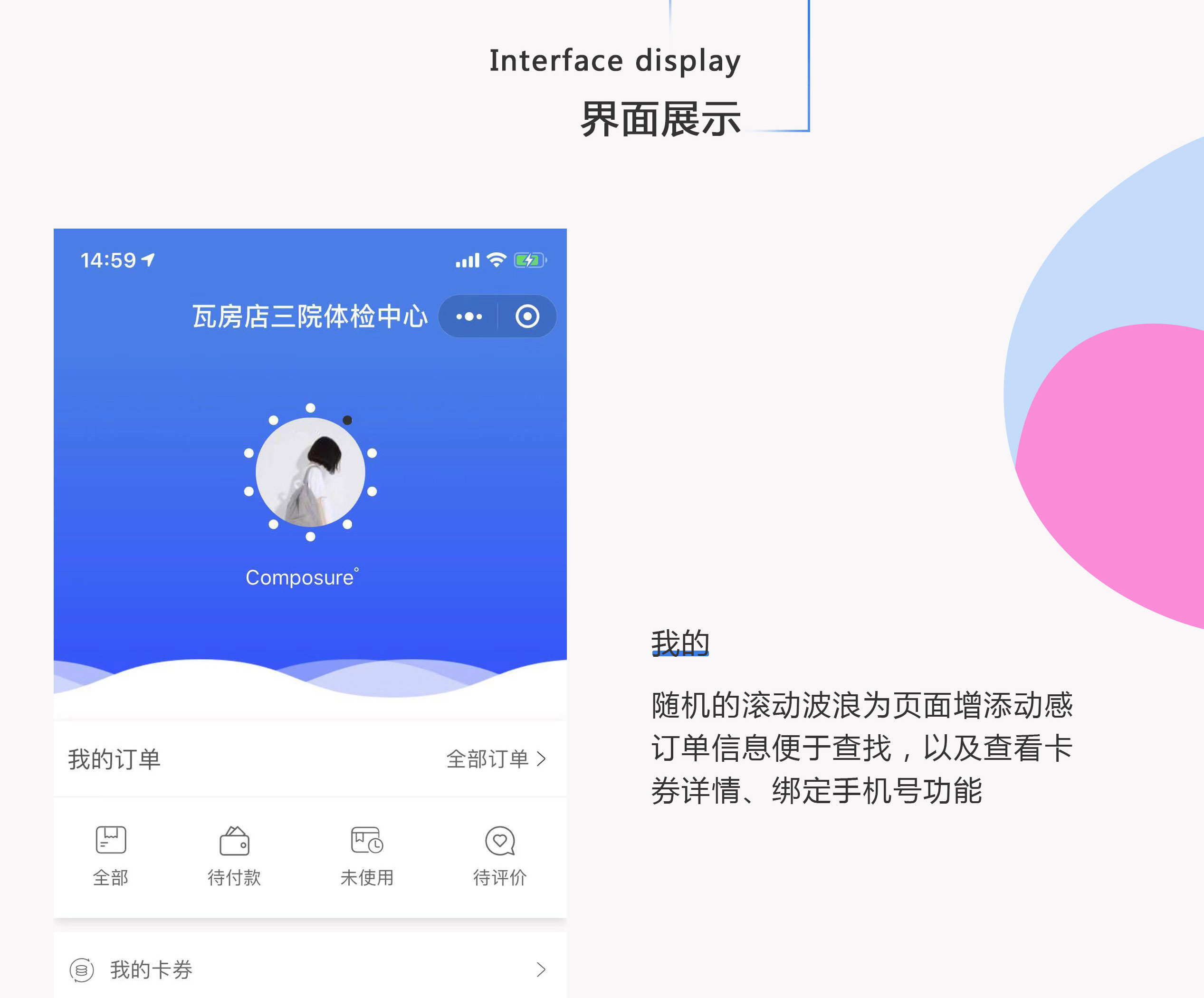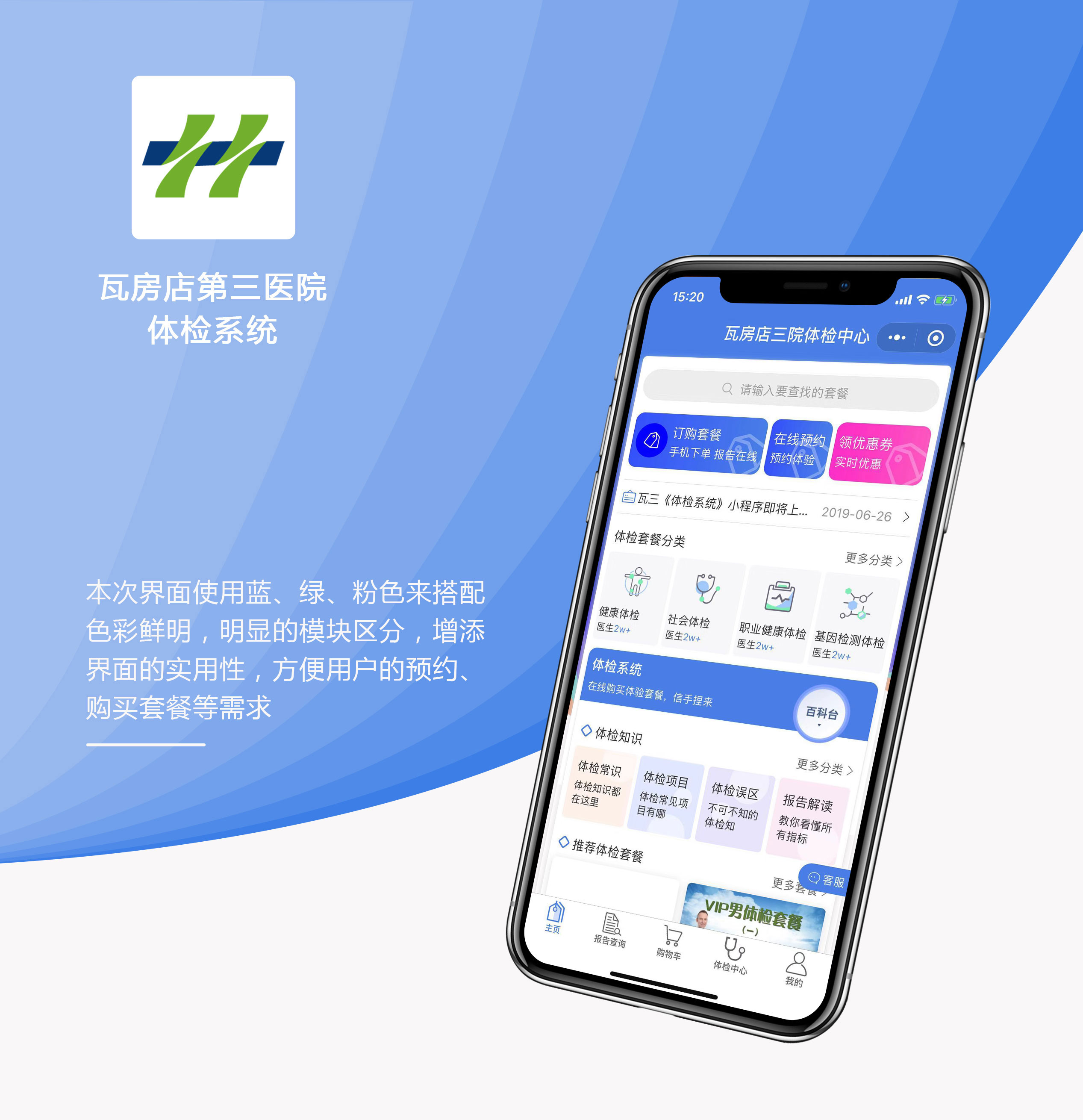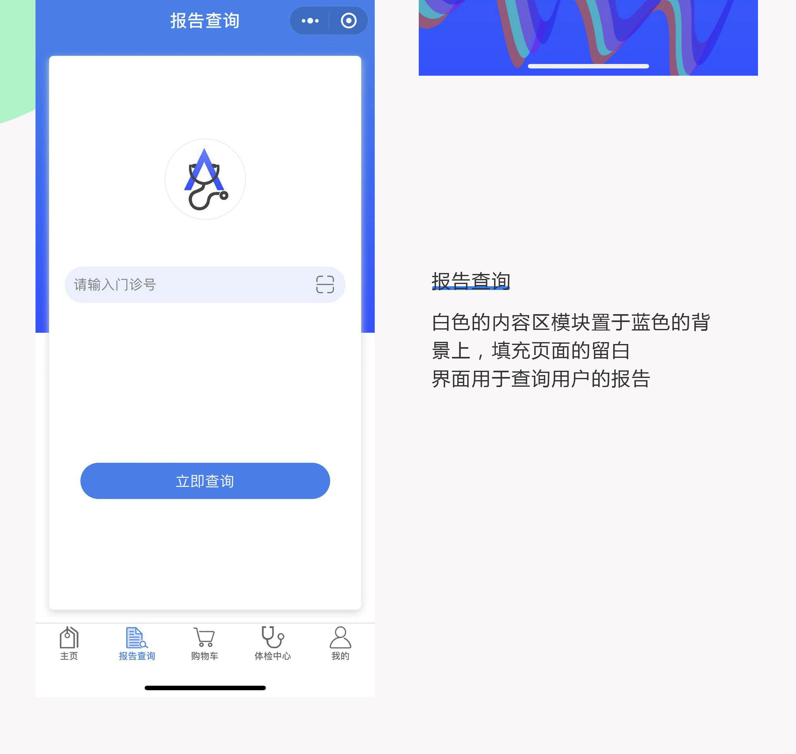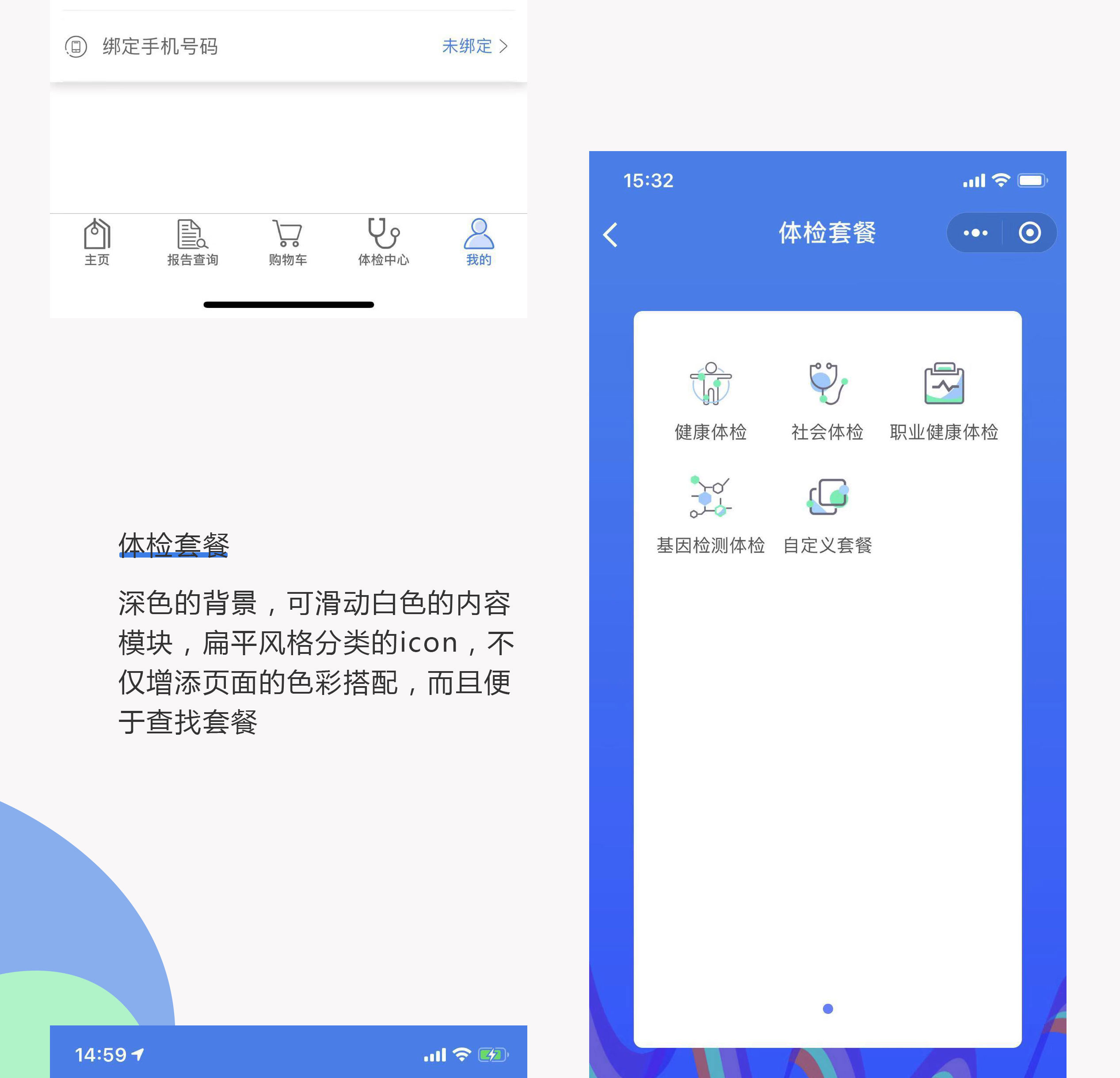设计理念:体检系统小程序,采用蓝白色系搭配,清晰地模块分类,突出内容。