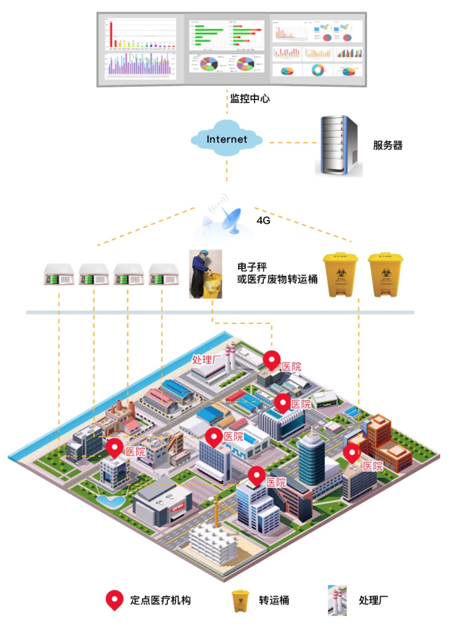 系统集合小程序扫码、监控设备、蓝牙电子秤等技术,建立医疗废弃物从分类投放、分类收集、分类贮存、分类交接、分类转运直至分类处置的定点定向、全流程、可追溯、闭环式管理体系,实现医废信息实时上报和异常预警。